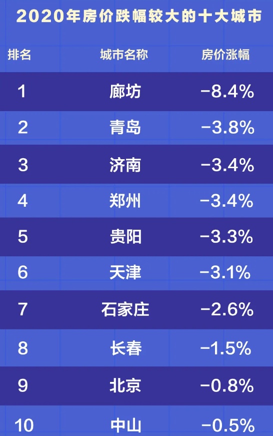 - 2020年十大房?jī)r(jià)下跌城市:北京、鄭州、青島上榜