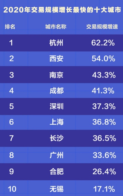 從交易增速來(lái)看,強(qiáng)二線城市穩(wěn)居前列。二手房交易額增速最快的4個(gè)城市分別是杭州、西安、南京和成都,均超過(guò)了40%,其中杭州增速達(dá)62.2%。這四個(gè)城市同時(shí)也是二手房交易量增速最快的四個(gè)城市。這也說(shuō)明,近年來(lái)隨著強(qiáng)二線城市崛起,人口大量涌入到這些城市,這些城市不僅新房快速增加,買二手房的也越來(lái)越多。