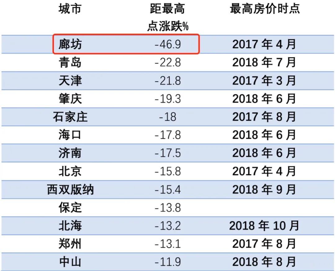 社科院《中國(guó)住房大數(shù)據(jù)分析報(bào)告(2020)》顯示,城市房地產(chǎn)市場(chǎng)分化較為嚴(yán)重,與歷史高點(diǎn)相比,20個(gè)城市下跌超過(guò)10%,其中9個(gè)城市距最高點(diǎn)房?jī)r(jià)調(diào)整幅度均在15%以上,廊坊市最高下調(diào)幅度達(dá)46.9%。