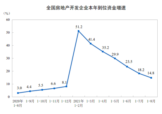 1—8月份,房地產(chǎn)開(kāi)發(fā)企業(yè)到位資金134364億元,同比增長(zhǎng)14.8%;比2019年1—8月份增長(zhǎng)18.1%,兩年平均增長(zhǎng)8.7%。其中,國(guó)內(nèi)貸款16918億元,下降6.1%;利用外資53億元,下降47.5%;自籌資金40773億元,增長(zhǎng)9.3%;定金及預(yù)收款50997億元,增長(zhǎng)31.3%;個(gè)人按揭貸款21490億元,增長(zhǎng)13.4%。