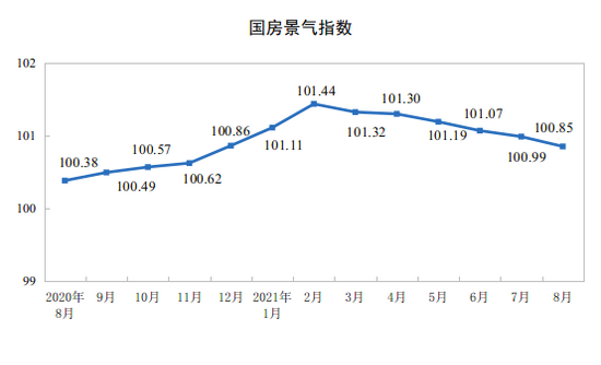 8月份,房地產(chǎn)開(kāi)發(fā)景氣指數(shù)(簡(jiǎn)稱“國(guó)房景氣指數(shù)”)為100.85。