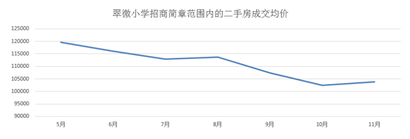 “價格較年初下跌約10%-15%,同小區(qū)個別兩居室最多可能降200萬。”小玉對90度表示,翠微小學招商簡章范圍內的學區(qū)房價格在5月達到高點,單價接近12萬,9月降至10.7萬,10月又降了5000元左右,11月至今比較穩(wěn)定。