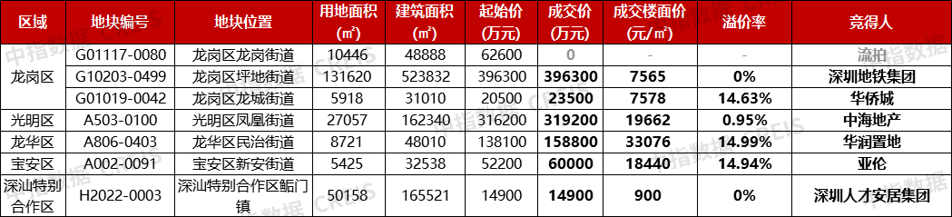 此外,位于光明區(qū)的A503-0100號(hào)地塊由中海地產(chǎn)以總價(jià)31.92億元競(jìng)得,溢價(jià)率0.95%;位于龍崗區(qū)坪地街道的G10203-0499號(hào)地塊由深圳地鐵集團(tuán)以底價(jià)39.63摘得;位于龍崗區(qū)龍崗街道G01117-0080號(hào)地塊因無(wú)人報(bào)價(jià)而流拍。寶安新安A002-0091地塊地塊由江蘇亞倫集團(tuán)觸頂6億元摘得;G01019-0042地塊由華僑城觸頂2.35億元摘得。